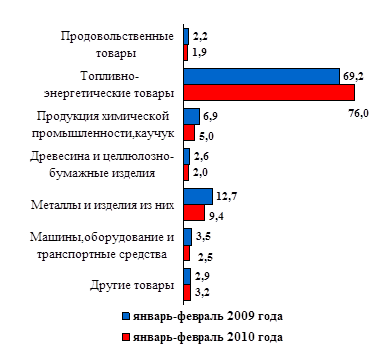 В товарной структуре импорта России из стран дальнего зарубежья в январе-феврале 2010 г. по сравнению с январем-февралем 2009 г. увеличились доли продовольственных товаров и сельскохозяйственного сырья (кроме текстильного), продукции химической промышленности и каучука, металлов и изделий из них; сократился удельный вес машин, оборудования и транспортных средств, текстиля, текстильных изделий и обуви.
