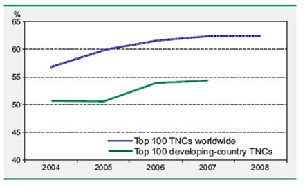 Глобальные ТНК последовательно проводят стратегию образования крупных групп, объединяющих производственные, торговые и финансовые компании. В современных условиях глобальные корпорации представляют всю мощь современного мирового финансового капитала. В наибольшей степени к глобализации тяготеют информационная, электронная, химическая, электротехническая, нефтяная, автомобильная, банковская и некоторые другие отрасли. Общемировую значимость имеют 100 глобальных корпораций. В 2009 г. активы этих компаний составляли 9% общего количества зарубежных активов, 16% объема продаж и 11% числа занятых всех ТНК. На зарубежную сеть 100 крупнейших фирм пришлось примерно 4% МВВП. Итак, основной движущей силой процесса транснационализации и глобализации экономики являются ТНК. Начиная с 1990 г. ЮНКТАД в своих документах и публикациях использует такое понятие, как «индекс транснациональности» компаний. За период с 1992 по 2009 г. индекс транснациональности 100 крупнейших ТНК увеличился на 12% (с 51 до 63%), причем основное увеличение приходилось на показатель зарубежных активов. На рис. 2 представлен график увеличения индекса за последние 5 лет.