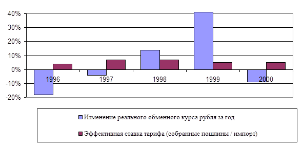 Рис.1. Обменный курс – главное средство защиты отечественного производителя: амплитуда колебаний реального валютного курса за год превышает ставки импортных тарифов.