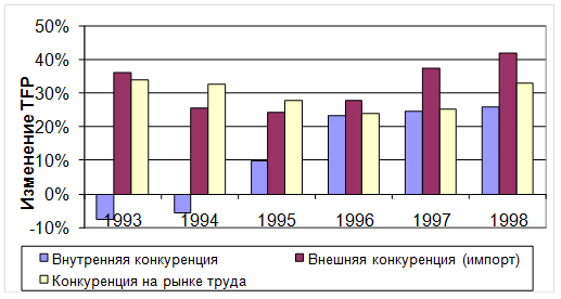 В тех секторах, где удалось обеспечить возникновение конкурентной среды, производительность действительно выросла, причем важна как внешняя, так и внутренняя конкуренция, а также конкуренция на рынке труда (см. Рис.3). Кстати, и бартер получил широкое распространение именно в неконкурентных отраслях: по расчетам Гуриева и Квасова, в 1996-97 гг. при прочих равных в монополизированных отраслях доля бартера в выручке была на 15-20% больше, чем в конкурентных.
