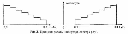 Инверсный скремблер осуществляет преобразование речевого спектра, равносильное повороту частотной полосы речевого сигнала вокруг некоторой средней точки (рис.3). При этом достигается эффект преобразования низких частот в высокие частоты, и наоборот.