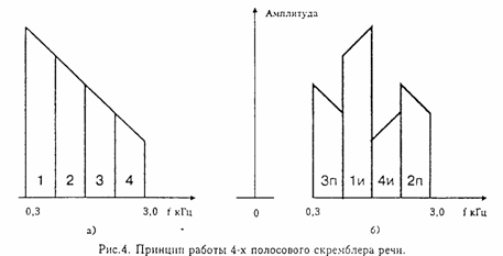 Речевой спектр можно также разделить на несколько частотных полос равной ширины и произвести их перемешивание и инверсию по некоторому правилу (ключ системы). Так функционирует полосовой скремблер (рис.4).