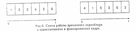 Для повышения уровня закрытия прибегают к способу перестановки временных отрезков речевого сигнала в пределах фиксированного кадра (рис.6). Правило перестановок является ключом системы, изменением которого можно существенно повысить степень закрытия речи. Остаточная разборчивость зависит от длительностей отрезков сигнала и кадра и с увеличением последнего уменьшается.