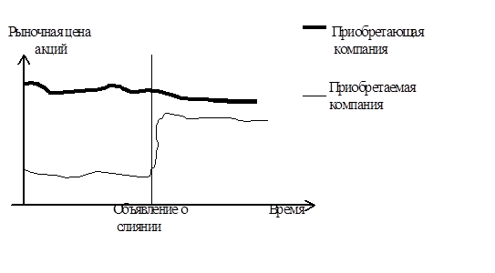 Таким образом, если акционеры приобретаемой компании выгоду от слияния имеют уже при объявлении о слиянии, то для акционеров приобретающей компании выгода носит, скорее, долгосрочный характер. Их доля в общей выгоде от слияния вернется к ним, когда объединенная компания начнет свое функционирование и когда синергетический эффект начнет действовать, способствуя генерированию стабильно высоких денежных потоков. Только тогда, когда они будут уверены в этом, когда у них появится надежда на получение высоких дивидендов, рыночная цена объединенной компании начнет расти, способствуя увеличению благосостояния акционеров приобретающей компании.
