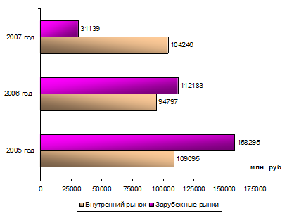 Как следует из данных, представленных в таблице 8, доля экспорта в общем объеме продаж в 2007 году по сравнению с 2006 годом сократилась на 31,2%, а по сравнению с 2005 годом – на 36,2%. При этом выручка от реализации продукции на экспорт сократилась в 2007 году по сравнению с 2006 годом на 81044,6 млн. р., а по сравнению с 2005 годом – на 127156 млн. р. В относительном выражении снижение выручки от реализации продукции на экспорт в 2007 году по сравнению с 2006 годом составило 72,74%, а в целом за период – 80,33%.