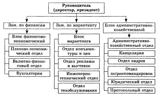 Возглавляет такую фирму руководитель (директор, президент), в зависимости от объема работы ему помогают один-два заместителя, например, по маркетингу и по финансам. В других вариантах директор может непосредственно руководить и финансовым, и административно-хозяйственным блоками.