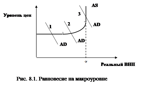 Если кривая совокупного спроса AD смещается на горизонтальном отрезке кривой AS, то изменяется только реальный объем ВНП; если на промежуточном – то изменяется и номинальный и реальный ВНП; если на вертикальном – то реальный ВНП остается неизменным, но происходит увеличение цен.