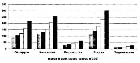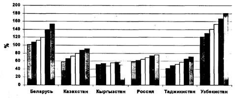 С учетом достижений предшествующих ЕврАзЭС интеграционных организаций, которые на данный момент интегрировались в Евразийское Экономическое Сообщество, можно с уверенностью говорить о продвижении процессов регионального развития, особенно очевидного после 1995 года. Надо заметить, что с того времени интеграция постоянно способствует повышению уровня и качества жизни населения стран ЕврАзЭС (рис.3-5).