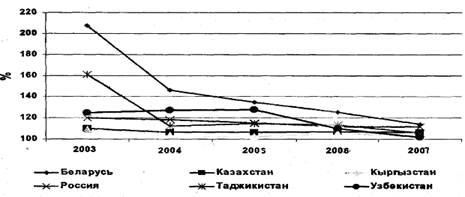 Рисунок 3 - Индексы потребительских цен стран-членов ЕврАзЭС (в % к предыдущему году)