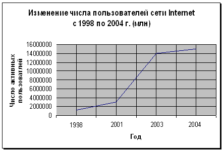 По официальным данным в 1998 г. у нас насчитывалось лишь около одного миллиона постоянных пользователей сети. Однако к настоящему время количество пользователей увеличилось в десятки раз, и к концу 2004 г. обещает составить порядка 18 миллионов человек.