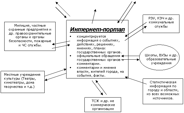 С помощью Интернет портала можно обеспечить феноменальную оперативность сбора информации и управления. Т.к. он будет использоваться как посредник в обмене информацией (и служебной в частности) между структурными подразделениями органов власти и всеми субъектами управления.