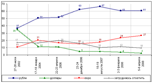Американская же валюта не пользуется популярностью - за последние шесть лет ее престиж существенно снизился (с 35% "доверявших" доллару в 2002 году до сегодняшних 4%). Но если доверие россиян к доллару по сравнению с апрелем этого года остается практически на том же уровне, то отношение к евро претерпело за то же время некоторые изменения - показатель доверия единой европейской валюте снизился на 9 п. п. (с 27% до 18%). Среди молодежи, людей с высшим образованием, высокими доходами, жителей мегаполисов зафиксированы наибольшие доли "поклонников" евро (24-27%) и наименьшие - российского рубля (52-57%).