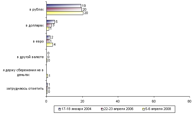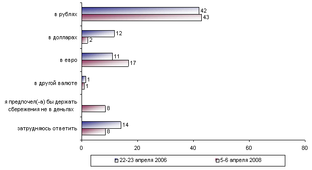 Вопрос четвертый: «А если бы у Вас были сбережения, в какой валюте Вы предпочли бы их держать - в рублях, в долларах, в евро или в другой валюте? (Ответы заявивших, что у них нет накоплений, сбережений, и затруднившихся ответить на вопрос о наличии сбережений, - 75% от всех опрошенных. Любое число ответов.)» (график №6).