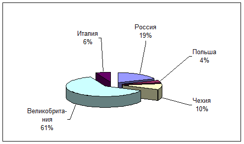 Самые крупные экспортные поставки ОАО «Кожевенный завод Гатово» осуществляют в Великобританию (Приложение Г), на долю которых приходится 61%. Второе место по объему экспортных операций занимает Россия (Приложение Д) – 19%. Потом идут Чехия, Италия, Польша. Импортные операции отражены на рис. 2.2.
