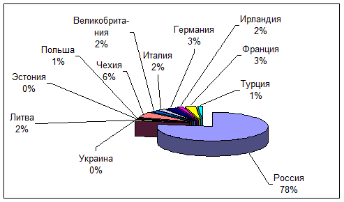 Самые крупные импортные операции ОАО «Кожевенный завод Гатово» осуществляет с Россией (Приложение И), на долю которой приходится 78%. Второе место по объему импортных операций занимает Чехия – 6%. Потом идут: Германия, Франция, Великобритания, Литва, Италия (Приложение К). Экспортные операции отражены на рис. 2.3.