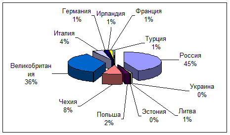Самым крупным деловым партнером по экспортно-импортным операциям ОАО «Кожевенный завод Гатово» является Россия, на ее долю по этим операциям приходится 45% от суммы всех экспортно-импортных операций. Вторым по общему объему экспортно-импортных операций партнером ОАО «Кожевенный завод Гатово» является Великобритания, на ее долю приходится 36% от общей суммы экспортно-импортных операций. Структура экспортно-импортных операций отражена на рис. 2.4.