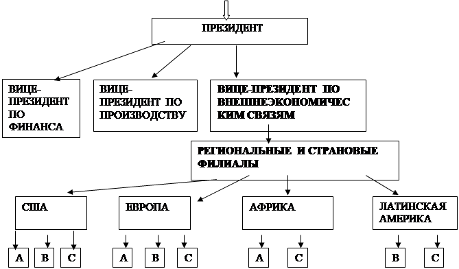 Проблемы совершенствования структуры управления руководство ТНК решает в зависимости от ассортимента товаров и услуг, с которыми они выходят на мировой рынок. Корпорации, специализирующиеся на производстве однородной продукции, обычно строят структуру управления по географическому принципу. В частности, такая структура управления позволяет швейцарской корпорации "Нестле" проводить единую технологическую политику для производства своей продукции по всему миру с учётом национального спроса в принимающих странах. (см. рис.2). 1