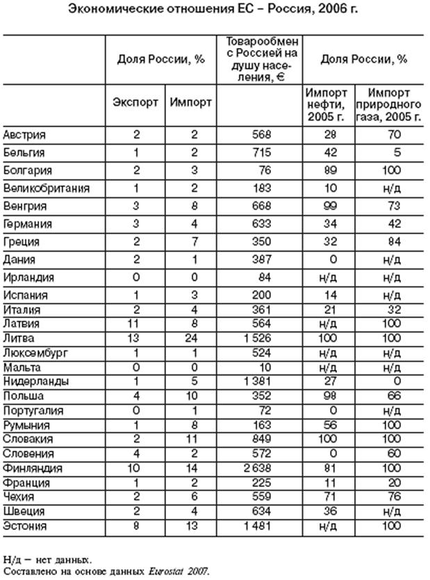 Подобное положение дел будет меняться по мере резкого увеличения объемов российского импорта и одновременной стагнации экспорта. Однако если на все это взглянуть под другим углом, картина в значительной степени меняется. По данным «Евростата», экспорт в Россию из стран ЕС составил в 2002г. 24,8 млрд. долл., в то время как импорт из России - 42,3 млрд. долл. Доля России в торговле ЕС настолько незначительна, что сопоставима с долей Норвегии как торгового партнера.[9] В общем и целом страны ЕС остаются главным торговым партнером России, на их долю приходилась примерно треть ее внешнеторгового товарооборота в 2000г. Это достаточно высокий уровень зависимости. К примеру, на долю США и Японии приходится очень незначительная доля внешней торговли России (соответственно 6% и 1,3%). Сравнение между такой международной организацией, как ЕС, и таким суверенным государством, как Соединенные Штаты, может показаться случайным, однако оно оправданно, поскольку члены ЕС не имеют суверенной торговой политики. Поэтому Россия в реальности ведет торговлю именно с Европейским союзом, а не с Германией, Францией и прочими его членами.