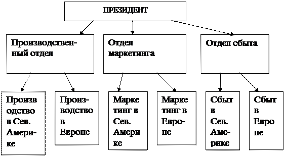 Функциональная структура характерная для начального этапа развития международной деятельности, когда степень транснационализации фирмы низкая, и деятельность фирмы ориентирована в основном на национальные рынки. Основные функциональные отделы: производство, реализация, научно-исследовательская и разведывательная деятельность, маркетинг, финансы, подчиняются непосредственно президенту фирмы (рис.6.1).