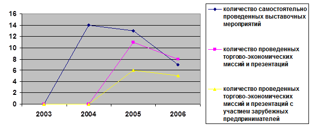 Рассмотрим выставочно-ярмарочную деятельность по количеству самостоятельно проведенных выставочных мероприятий, проведенных торгово-экономических миссий и презентаций, в том числе с участием зарубежных предпринимателей.