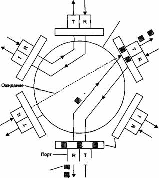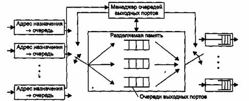 Входные блоки процессоров портов соединяются с переключаемым входом разделяемой памяти, а выходные блоки этих же процессоров соединяются с переключаемым выходом этой памяти. Переключением входа и выхода разделяемой памяти управляет менеджер очередей выходных портов. В разделяемой памяти менеджер организует несколько очередей данных, по одной для каждого выходного порта. Входные блоки процессоров передают менеджеру портов запросы на запись данных в очередь того порта, который соответствует адресу назначения пакета. Менеджер по очереди подключает вход памяти к одному из входных блоков процессоров и тот переписывает часть данных кадра в очередь определенного выходного порта. По мере заполнения очередей менеджер производит также поочередное подключение выхода разделяемой памяти к выходным блокам процессоров портов, и данные из очереди переписываются в выходной буфер процессора.
