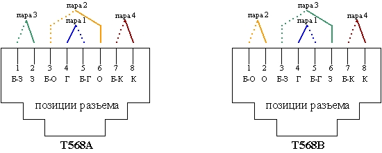 Рис.8 Схемы разводки T568A и T568B, определенные в стандарте ANSI/TIA/EIA-568-A.