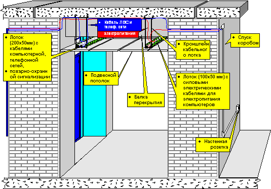В рабочих помещениях прокладка кабеля в соответствии с требованиями этой проектной работы будет выполняться в декоративных коробах (располагаются на высоте 1 м. от пола). Для перехода от лотков к коробам в стенках рабочих помещений сверлятся отверстия, в которые устанавливаются закладные трубы. Согласно приведенным выше расчетам, в каждой комнате устанавливается по 11 блоков розеток – по четыре с двух сторон и по три с одной.