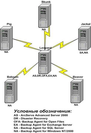 Для проведения операций резервного копирования информации будет использован сервер ARCServe производства фирмы CA. Резервное копирование проводится по следующей схеме: