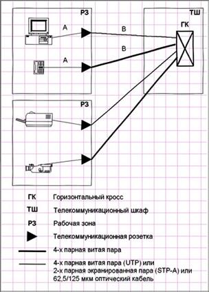 Горизонтальная кабельная система должна иметь топологическую конфигурацию "звезда". Каждое рабочее место соединено непосредственно с горизонтальным кроссом (НС) в телекоммуникационном шкафу (ТС). Максимальная протяженность любого горизонтального кабельного сегмента не должна превышать 90 м независимо от типа используемой передающей среды.