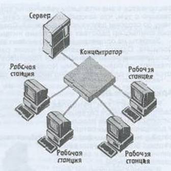 Для построения сети с звездообразной архитектурой в центре сети необходимо разместить концентратор. Его основная функция - обеспечение связи между компьютерами, входящими в сеть. То есть все компьютеры, включая файл-сервер, не связываются непосредственно друг с другом, а присоединяются к концентратору. Такая структура надежнее, поскольку в случае выхода из строя одной из рабочих станций все остальные сохраняют работоспособность. В сетях же с шинной топологией в случае повреждения кабеля хотя бы в одном месте происходит разрыв единственного физического канала, необходимого для движения сигнала. Кроме того, сети с звездообразной топологией поддерживают технологии Fast Ethernet и Gigabit Ethernet, что позволяет увеличить пропускную способность сети в десятки и даже сотни раз (разумеется при использовании соответствующих сетевых адаптеров и кабелей).