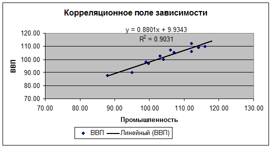 Построим корреляционное поле зависимости, чтобы сделать первоначальное предположение о существовании связи между ВВП и промышленностью Украины.
