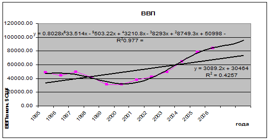 По графику можно предположить, что объем ВВП Украины будет расти в следующие 2 года по прогнозу как полиномиального, так и линейного типа Тренда. Но мы не можем с полной уверенностью утверждать, что наши предсказания по линии тренда достаточно точно предскажут реальный уровень ВВП через 2 года, так как линия тренда не учитывает многие посторонние факторы, оказывающие существенное влияние на их изменение. В настоящее время в Украине довольно нестабильная политическая ситуация, а это очень важный фактор, влияющий на объем ВВП.