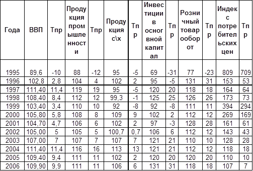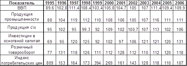 Основные показатели социально-экономического развития, отражающие развитие экономики Белоруссии за период с 1995-2006 года (в % к предыдущему году). [6]