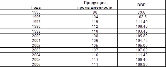 Показатели промышленности и ВВП Белоруссии (в % к предыдущему году).[7]