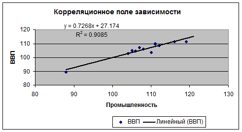 Построим корреляционное поле зависимости, чтобы сделать первоначальное предположение о существовании связи между ВВП и промышленностью Белоруссии.