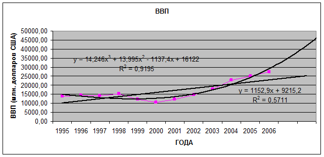 Важнейшими показателями экономического развития страны, как известно, является валовой внутренний продукт – это стоимость всего объема конечного производства товаров и услуг за определенный период (год, месяц, квартал). Поэтому построим линию Тренда, чтобы предсказать объем ВВП Белоруссии и тенденцию его развития в следующие 2 года.