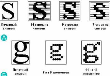 На рисунке показан вид символов, воспроизводимых на экране дисплея, при различном числе строк и элементов на знак.