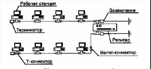 На концах сегмента должны находиться терминаторы, которые подключаются к свободным концам Т-коннекторов. Один (и только один!) терминатор в сегменте должен быть заземлен.