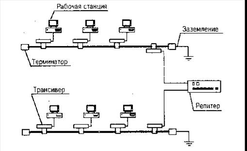 Каждая рабочая станция через сетевой адаптер (установлен на материнской плате компьютера и на рисунке не показан) специальным многожильным трансиверным кабелем подключается к устройству, называемому трансивером. Трансивер служит для подключения рабочей станции к толстому коаксиальному кабелю.