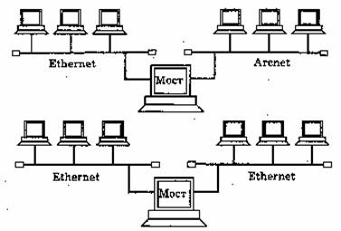 Мосты – наиболее простые устройства, служащие для объединения сетей с разными стандартами обмена, например Ethernet и Arcnet, или несколько сегментов одной и той же сети, например Ethernet.