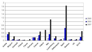 Доля мигрантов из новых стран-членов в старых странах (нас интересуют Словения, Румыния и Болгария как представительницы ЮВЕ) — членах ЕС Источник: Brücker and Damelang, 2009