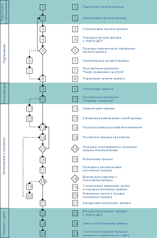 Этапы регистрации пропустим, так как регистрацию Приказа можно рассматривать как начальный этап контроля за его исполнением. После указания Руководителя (его заместителя) предприятия о постановке Приказа на контроль, специалист службы ДОУ проставляет реквизит "отметка о контроле" на левом поле Приказа напротив реквизита "заголовок к тексту" (реже - напротив контролируемых пунктов данного Приказа).