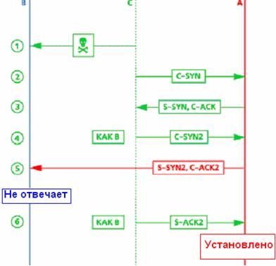 Дождавшись пакета S-SYN от сервера, крэкер высылает серверу пакет типа RST (сброс), конечно, с корректным порядковым номером, и, немедленно, вслед за ним фальшивый C-SYN-пакет от имени клиента