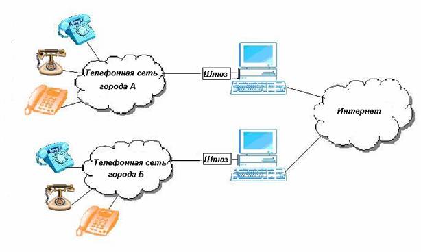 Рис. 1. Структурная схема организации телефонной связи через сеть Интернет с использованием шлюзов.