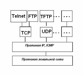 Протокол IP осуществляет передачу информации от узла к узлу сети в виде дискретных блоков - пакетов. При этом IP не несет ответственности за надежность доставки информации, целостность или сохранение порядка потока пакетов и, таким образом, не решает с необходимым для приложений качеством задачу передачи информации. Эту задачу решают два других протокола – TCP (Transfer Control Protocol, протокол управления передачей данных) и UDP (User Datagram Protocol, дейтаграммный протокол передачи данных) - которые, как говорят, "лежат" над IP (т. е. используют процедуры протокола IP для передачи информации, добавляя к ним свою дополнительную функциональность)