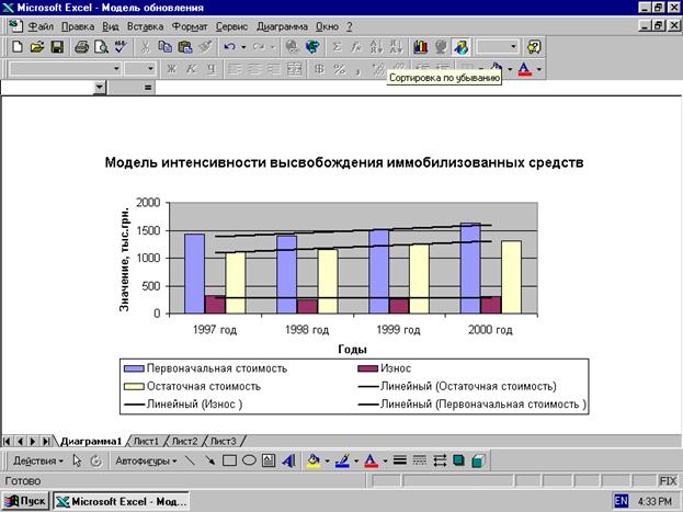 Если информации данной модели не достаточно для принятия управленческих решений при замене устаревшего оборудования, бухгалтер осуществляет построение модели минимизации затрат в течение всего срока службы основных средств.