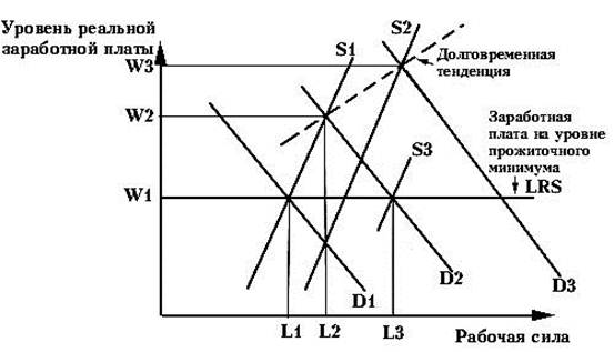 Смит выводит связь между спросом на труд и фондами, предназначенными для выплаты заработной платы. Не до конца раскрывая зависимость, он утверждает, что постоянное возрастание капитала влечёт за собой постоянно повышающийся спрос на рабочую силу. Рассмотрим график приведённый выше. Спрос, по Смиту, задаётся как величина фонда заработной платы, а предложение – как объём услуг труда. Заработная плата на уровне прожиточного минимума представляет собой «естественную» цену труда, как зарплату, необходимую для физического существования индивида, то есть самую низкую норму, которая только совместима с «простой человечностью». Сама по себе рабочая сила, предполагается, воспроизводится с постоянными издержками. «Рыночная» же цена труда в каждом моменте времени определяется спросом и предложением. В точке, где пересекаются исходные кривые предложения (S1) и спроса (D1) на труд, мы наблюдаем заработную плату на уровне минимальной (в этой точке «естественная» цена равна «рыночной» цене труда) W1, и объём предложения труда равный L1. Допустим теперь, что спрос на рабочую силу возрастает с D1 до D2. На каком-то коротком отрезке времени это увеличит заработную плату до W2 и количество предлагаемого труда до L2. Со временем, в ответ на увеличившуюся заработную плату, возрастёт и население, т.к. по Смиту «спрос на людей всегда регулирует воспроизводство людей». Это будет сдвигать кривую предложения труда пока она не достигнет точки пересечения с кривой D2, при которой опять восстановится W1, обеспечивающая лишь физическое существование, но с количеством труда, если так можно выразиться, равном L3. Если же мы предположим, что спрос на труд продолжал расти (D1<D2<D3), то прирост населения будет отставать от прироста капитала. То есть, мы будем наблюдать долговременную тенденцию (обозначенную на графике пунктиром), при которой всегда будет существовать нехватка рабочей силы в каждый момент и будет иметь место постоянное увеличение заработной платы (W2<W3<…) ввиду конкуренции между собственниками капитала. Таким образом, теория «прожиточного минимума» как теория долговременной стабильности заработной платы прекрасно сочетается с представлением о вековой тенденции заработной платы к росту в неопределённых пределах. «Спрос на рабочих и фонды, предназначенные на оплату их», говорил автор, в Северной Америке, «возрастают, по-видимому, ещё быстрее, чем число рабочих, предлагающих свой труд». Постоянное повышение заработной платы будет стимулировать возрастание численности населения, которая, в свою очередь, является для Смита непременным индикатором «процветания всякой страны».