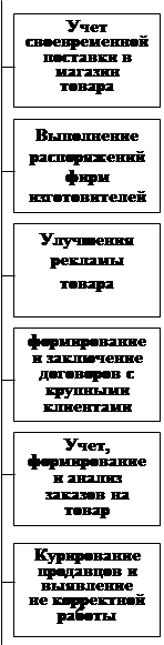 - по подсистеме «Менеджмент»: генеральный менеджер следит за своевременной поставкой в магазин товара, следит за соответствующими распоряжениями фирм изготовителей для коррекции цен и улучшения рекламы товара, а так же заключение и формирование договоров с крупными клиентами; учет, формирование и анализ заказов на товар; курирование над продавцами и выявление не корректной работы продавцов.