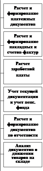 - по подсистеме «Бухгалтерия»: расчет и формирование платежных документов; расчет и формирование накладных и счетов-фактур; расчет заработной платы; учет текущей документации; учет пенсионного фонда; расчет и формирование документов по отчетности; анализ документов о движении товаров на складе;