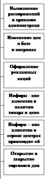 - по подсистеме «Информационный отдел»: выполнение распоряжений администрации; корректировка и изменение цен в базе и на витринах; оформление рекламных кампаний (акции); выдача информации клиентам о наличии товаров и её цене в магазине, открытие и закрытие торгового дня а так же выполнение обязанностей секретаря.